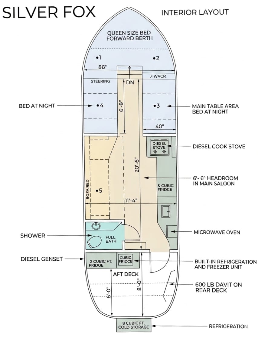The Silverfox comfortably sleeps 4 guests two in the forward birth, and two guests in the main salon.