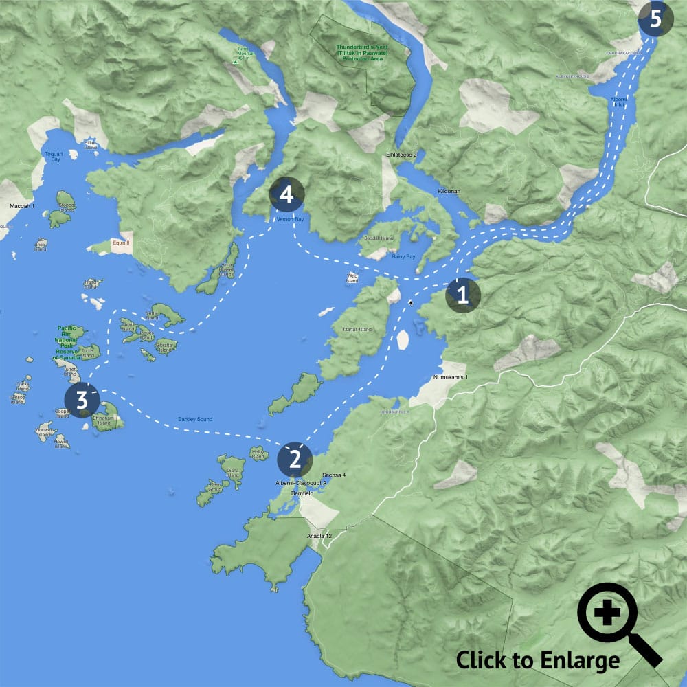 Discover the sandy beaches of Pacific Rim National Park within the Broken Group Islands – over 100 islands, inlets, and rocky outcrops nestled in the sheltered waters of Barkley Sound. Overnight in Vernon Bay.