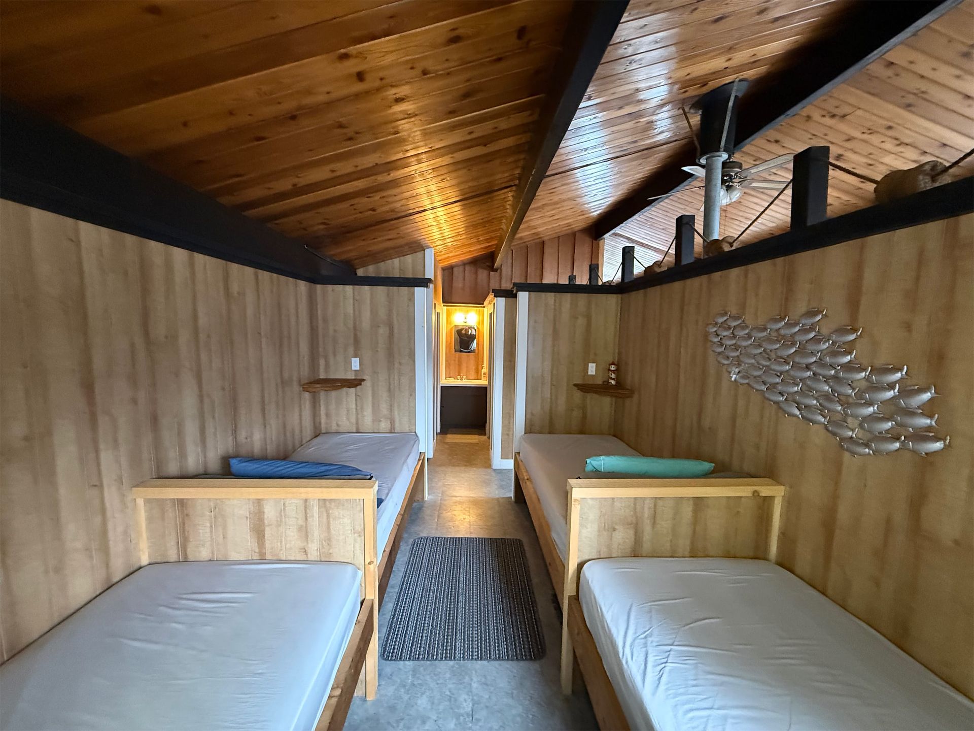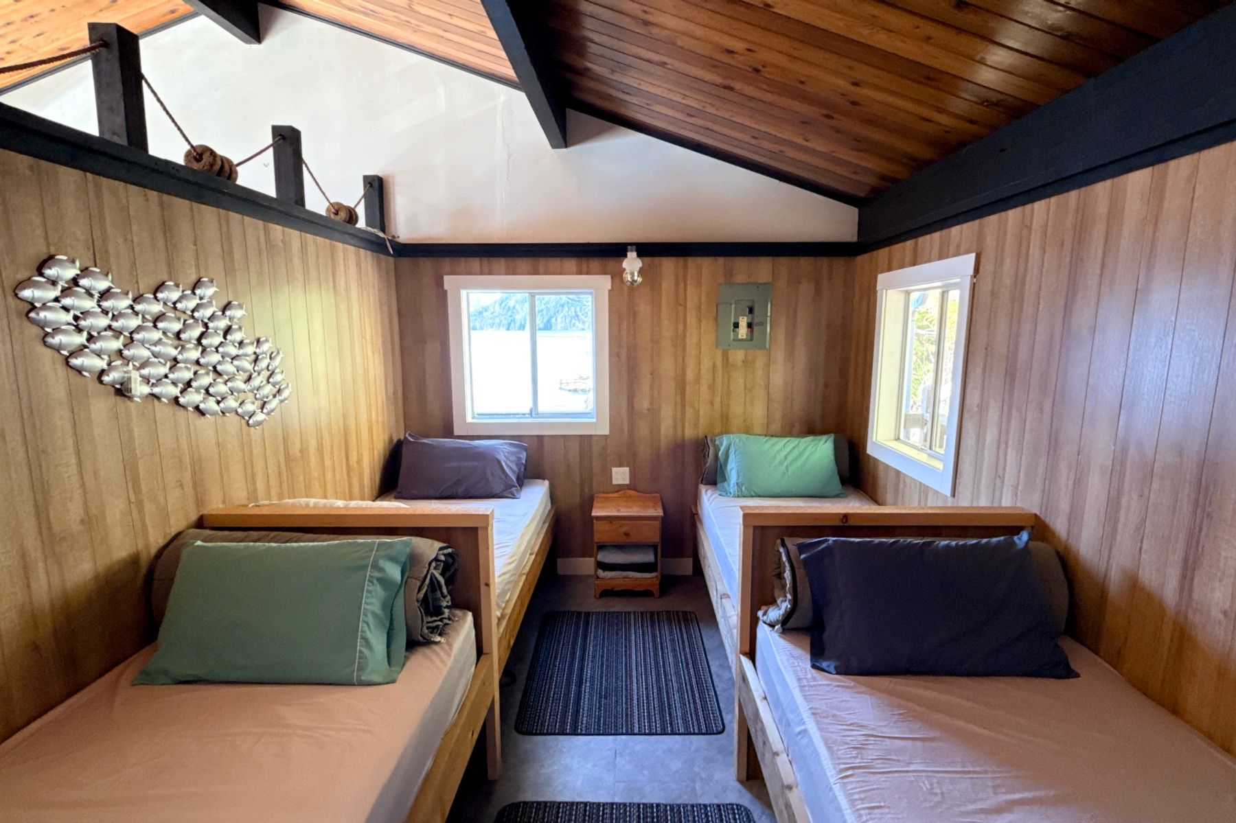 After a full day on the water, the lodge offers a quiet place to recharge. All four guests share our cozy bunk room, with four individual beds, clean linens, and fresh towels provided. Fall asleep to the sound of the tide and wake to soft coastal light filtering through the trees.