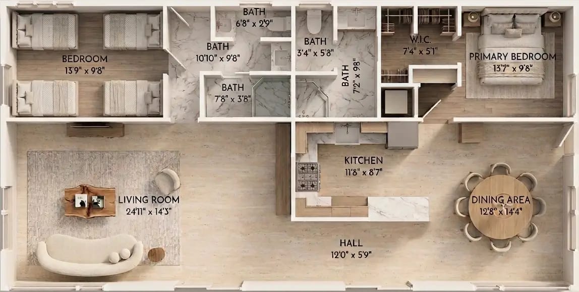 The lodge is designed for comfort and privacy in a shared space. A central vanity sits between two private rooms, each accessed by a pocket door. On one side is the W/C, on the other a shower room that also serves as a private changing area. Everything is close at hand while still giving each guest the privacy they need.